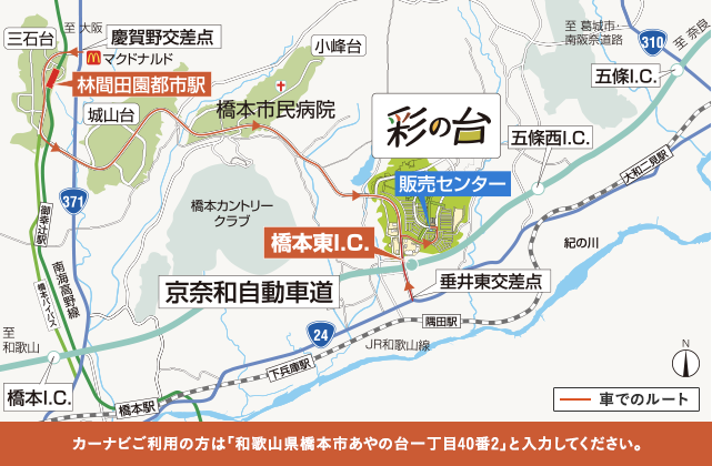 カーナビご利用の方は「和歌山県橋本市あやの台一丁目40番2」と入力してください。